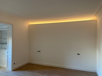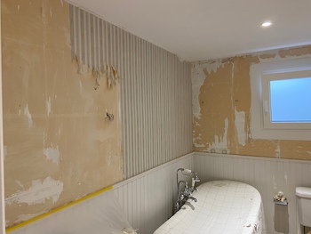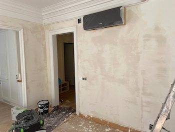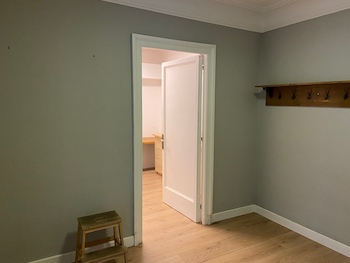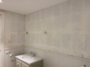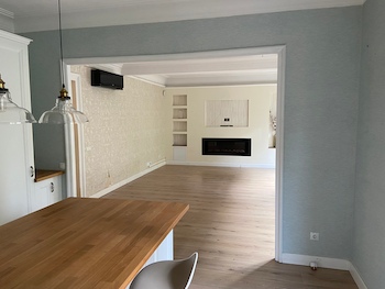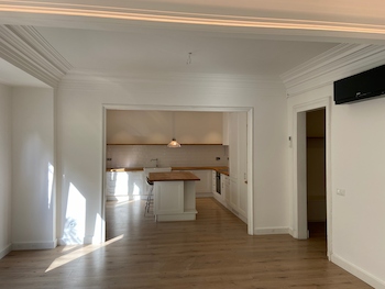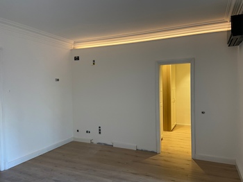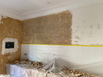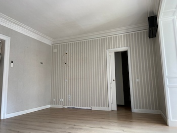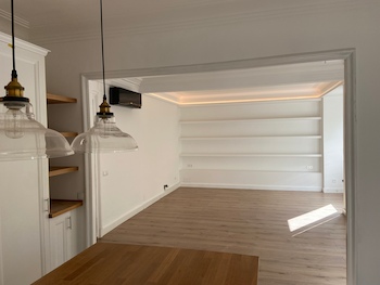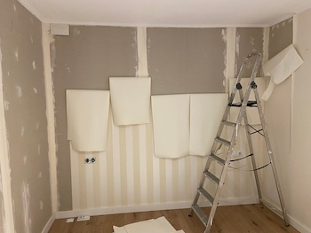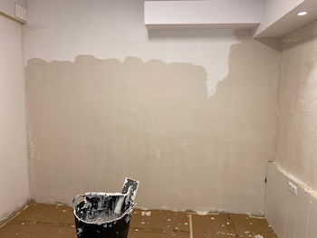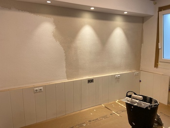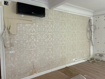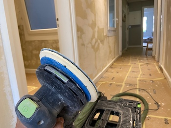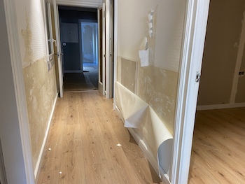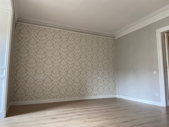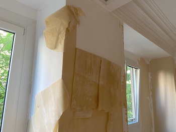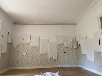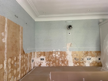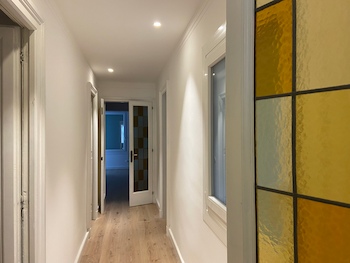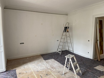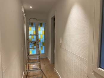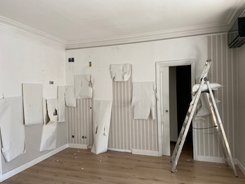 Projecte: Pis de 145 m2 a Gracia (BCN). Treure paper pintat de totes les estances del pis: menjador, cuina, bany, passadis, habitacions i vestidor. Algunes presentaven entre quatre i cinc capes de paper, amb pintura sobreposada o fins i tot col·locat directament sobre morter o rajoles.Polir parets de l’estudi per treure el gotelé. Procès que vam seguir: